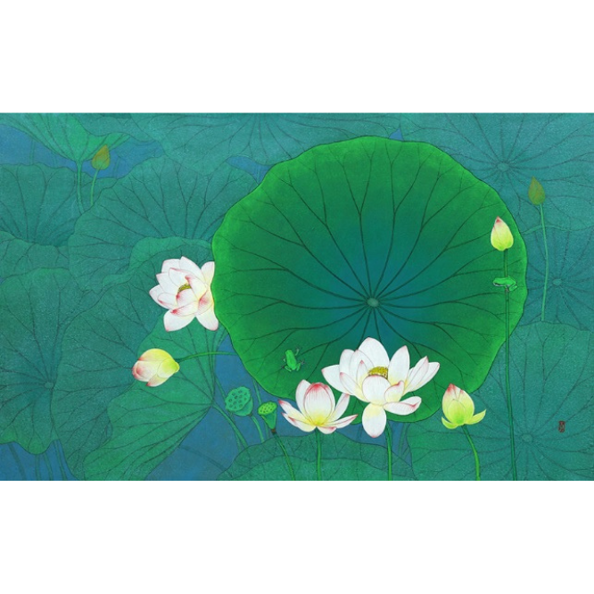 권광칠의 그림은 연꽃, 연잎과 청개구리나 작은 새가 등장하는 채색화이다.